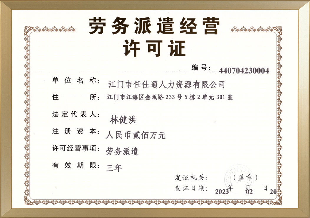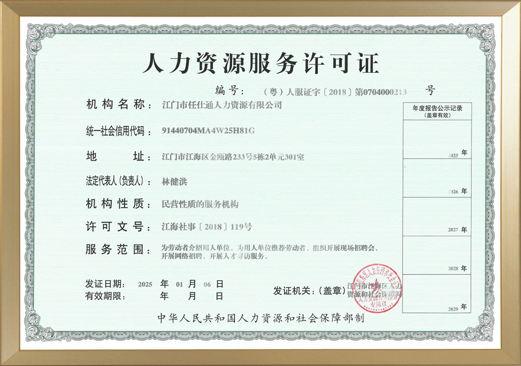 任仕通人力总部位于广州市,立足大湾区,面向华南地区,目前在广州、深圳、佛山、中山、江西均设有分公司,已取得人力资源和社会保障局颁发的<<劳务派遣经营许可证>>和<<人力资源服务许可证>>,通过了质量管理体系ISO9001:2015标准认证,荣获"江门市级5A人力资源诚信服务机构"的殊荣。
