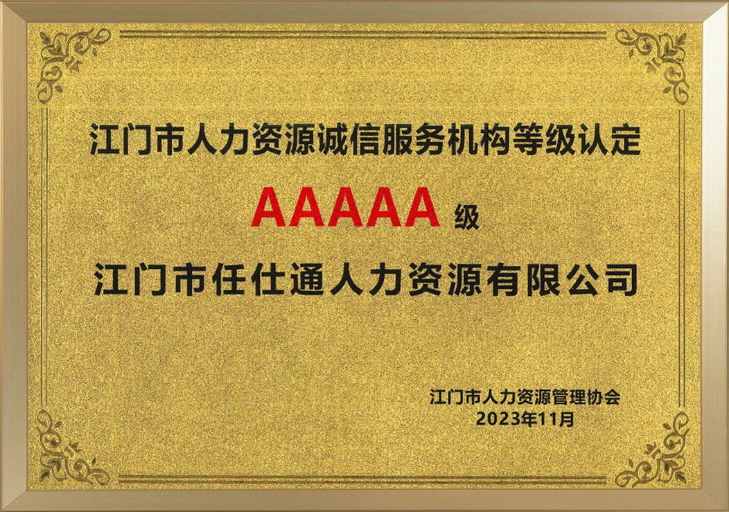 • 荣获江门市人力资源和社会保障局颁发的"市级5A人力资源诚信服务机构"